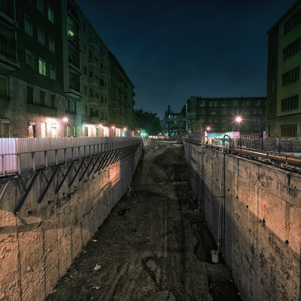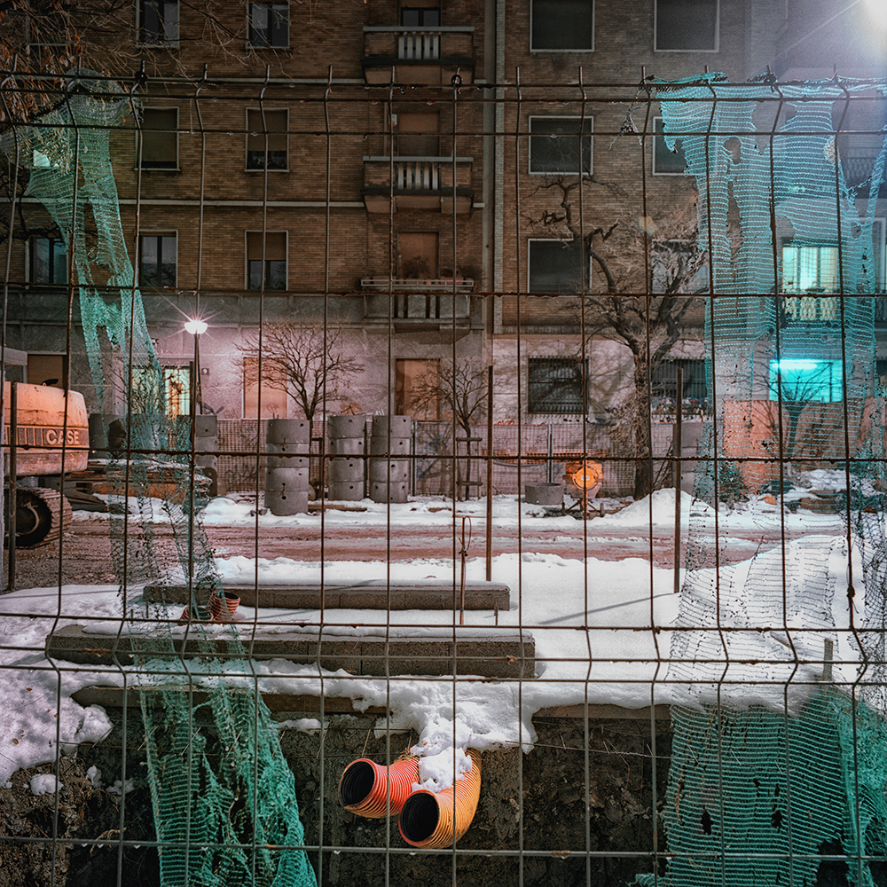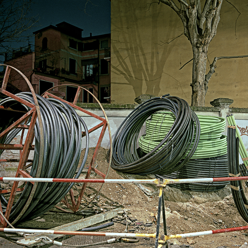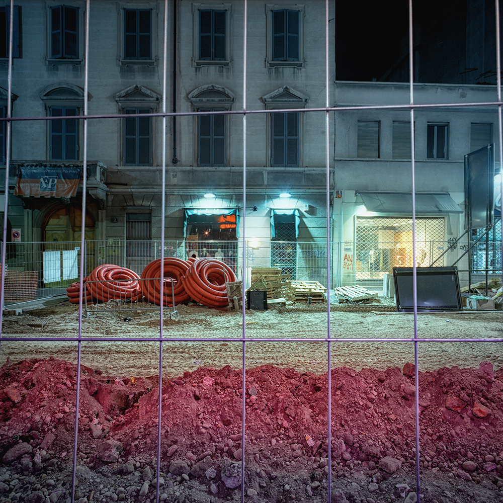 Mucchi di cavi, transenne, buchi, “luoghi crisalide” nella città vista come corpo ferito in trasformazione. Abbandonati a se stessi nelle tenebre della città, apparentemente immobili, composti, in attesa che la mano dell’uomo si rimetta al lavoro.